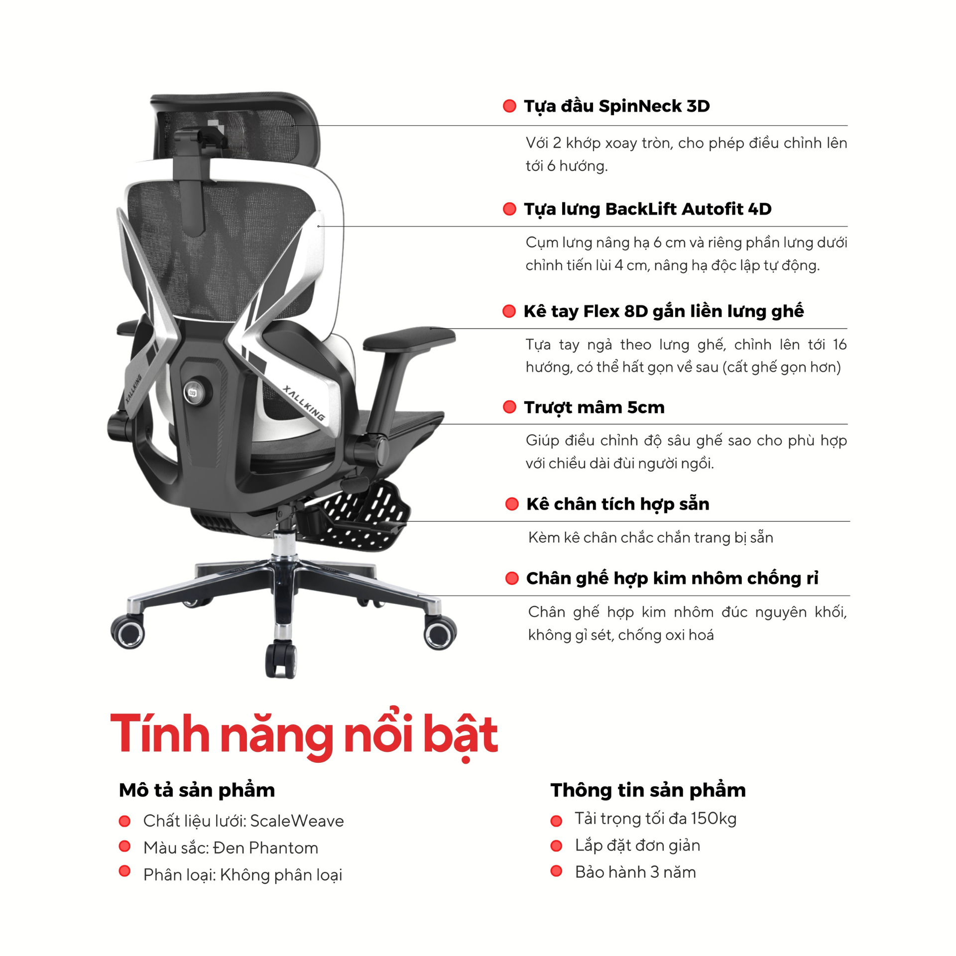 - Tải trọng tối đa 150kg